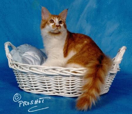 A Red Mackerel tabby with white male from Nite Stalker Buster Brown and Maison Du Chat Maya of Maine Chance